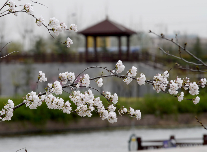 過了永昌西路,記者沿河堤繼續(xù)北行,右手邊的清潩河畔就是紙主題公園。這里零星栽植著一些櫻花。由于左側堤頂路正在施工,車輛無法通行,需要步行經(jīng)紙主題公園內(nèi)的園路才能通過。再往北,記者來到和景商業(yè)廣場(位于萬通大道以南、永昌西路以北、濱河路以西、勞動路以東)。其全長1050米,占地405畝,東側游園內(nèi)栽植的多種櫻花開得正好。記者看到,不時有蜜蜂在潔白如雪的花朵間飛來飛去,美景怡人。