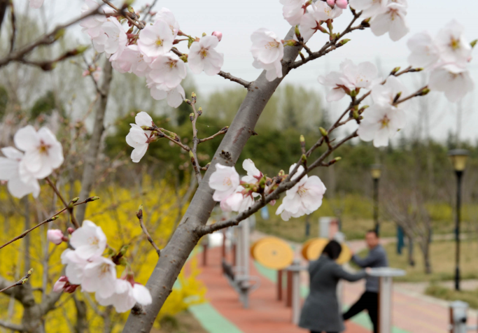 櫻花游園內(nèi),人們一邊健身,一邊欣賞櫻花。