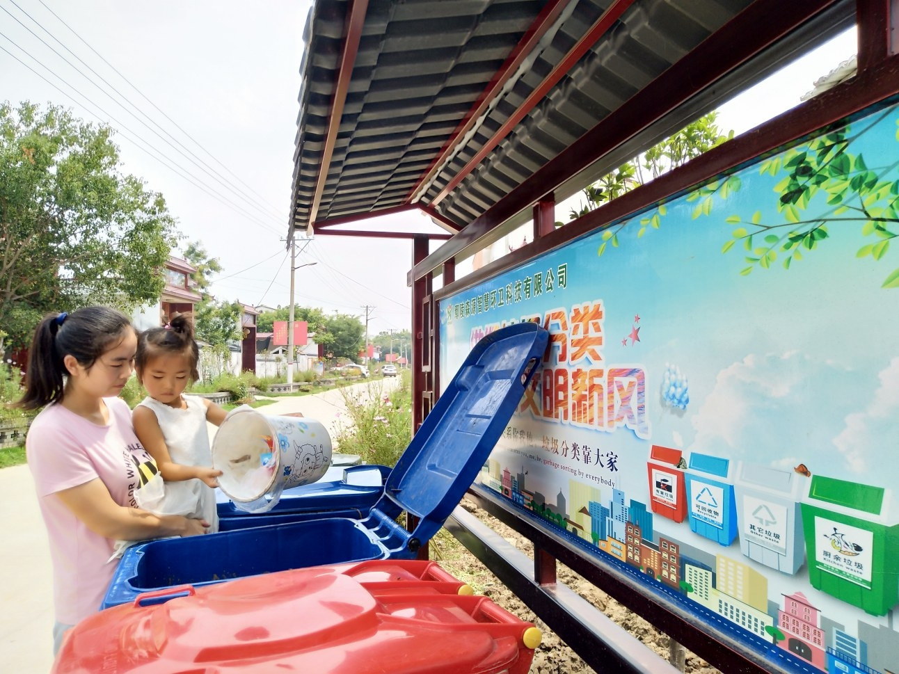 “媽媽,礦泉水瓶還有用吧?放這個桶吧?!? “對!曦曦真棒,媽媽給你點贊!” 7月25日9時許,在鄢陵縣大馬鎮(zhèn)屈崗社區(qū),記者一行遇到帶著女兒投放垃圾的居民吳小盈。