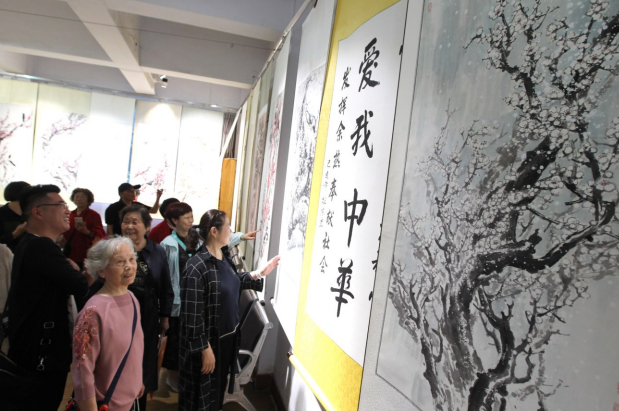 為慶祝中華人民共和國(guó)成立70周年,豐富老年人的精神文化生活,5月17日,許昌市委老干部局、許昌市老干部活動(dòng)中心聯(lián)合相關(guān)部門(mén)舉辦的“俎東喜書(shū)畫(huà)作品百梅展”在許昌市老干部活動(dòng)中心開(kāi)展。此次書(shū)畫(huà)展歷時(shí)4天,共展出作品120幅,并向參觀者贈(zèng)送《俎東喜書(shū)畫(huà)作品選集》400余冊(cè)。圖為市民在觀看參展作品。