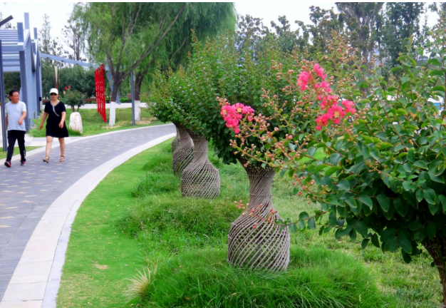 6月25日,中央公園,一排由紫薇編成的花瓶造型奪人眼球。近年來,中央公園在提升的過程中,打造了許多植物景觀造型,為市民游園增添不少樂趣。