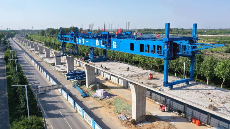 7月2日拍攝的鄭許市域鐵路許昌段高架區(qū)間的架梁施工現(xiàn)場(chǎng)。近日,鄭許市域鐵路許昌段施工人員冒高溫加緊施工趕進(jìn)度。目前,線路上橋梁工程筑基、承臺(tái)、墩柱、節(jié)段梁架設(shè)及現(xiàn)澆梁澆筑等工作正在有序進(jìn)行。鄭許市域鐵路建設(shè)項(xiàng)目是我市首條城市軌道交通骨干線,是推動(dòng)鄭許真正一體化的標(biāo)志性工程。中鐵十六局集團(tuán)負(fù)責(zé)承建的鄭許市域鐵路(許昌段)項(xiàng)目,全長(zhǎng)33.7公里,沿途設(shè)站11座,工程設(shè)計(jì)時(shí)速120公里,計(jì)劃2020年12月6日通車運(yùn)營(yíng)。記者 牛書培 攝