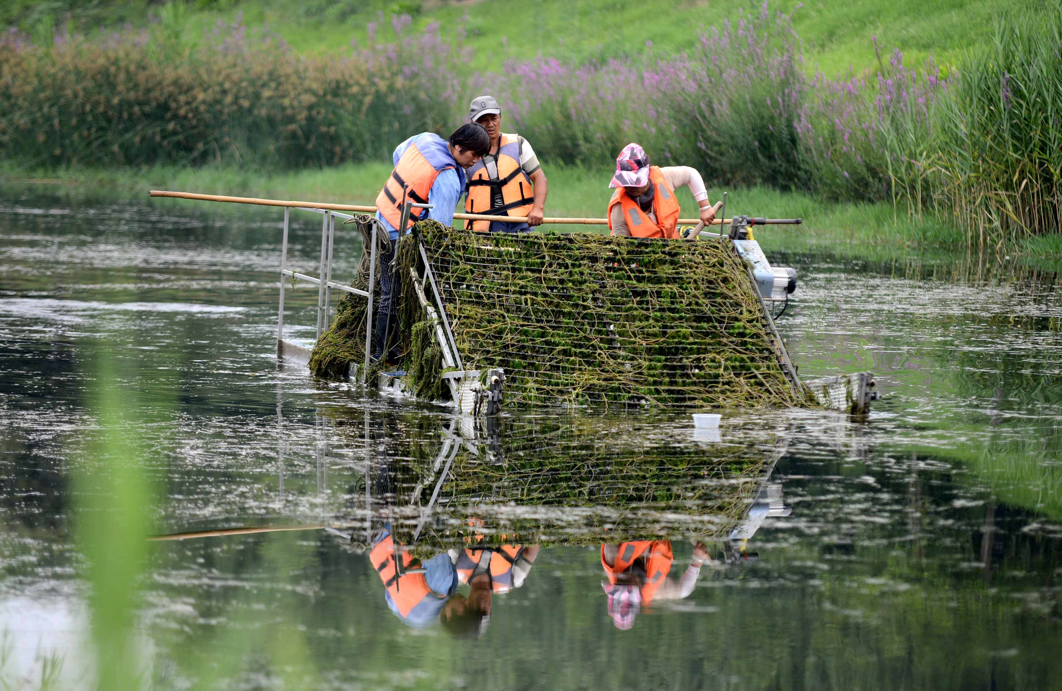 7月4日,市區(qū)灞陵河內(nèi),工人們正駕駛自動(dòng)水草收割船清理水草。進(jìn)入夏季,魏都區(qū)部分河道內(nèi)水草瘋長(zhǎng),當(dāng)?shù)厮畡?wù)部門(mén)及時(shí)派出人員,采用自動(dòng)水草收割船收割水草,“護(hù)航”水環(huán)境。