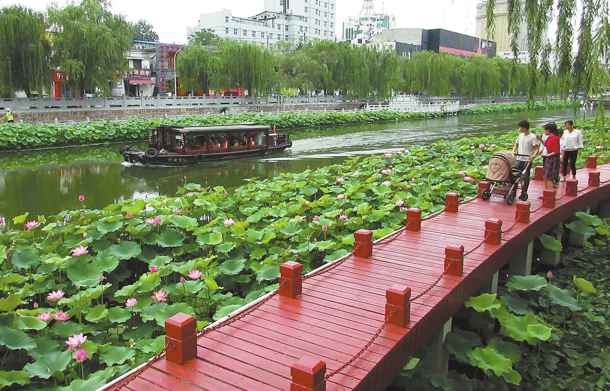 7月11日,市區(qū)護城河,市民在賞景游玩。當前,我市城區(qū)河湖水系內(nèi)的各色荷花進入盛花期,在綠葉的映襯下越發(fā)顯得婀娜多姿。 本報記者 喬利峰 攝