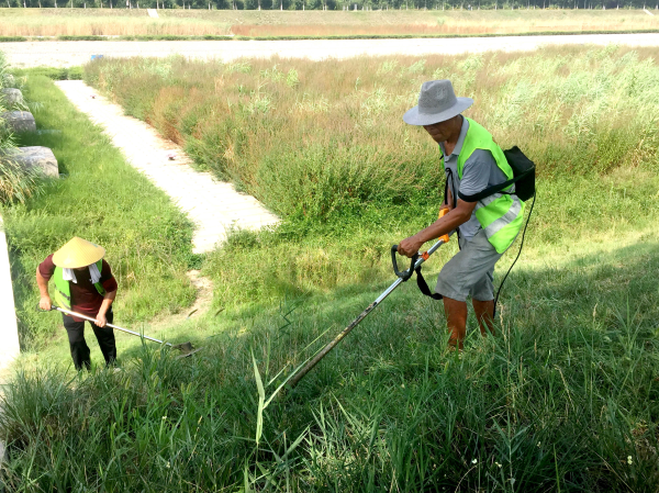 7月22日,清潩河畔,工人冒著高溫,手持小型電動(dòng)割草機(jī)修剪草坪。為確保清潩河畔環(huán)境良好,近日,我市水務(wù)部門(mén)組織人員對(duì)河岸草坪進(jìn)行修剪。一線工人不顧天氣炎熱,為城市的美麗默默奉獻(xiàn)。 記者 牛志勇 攝