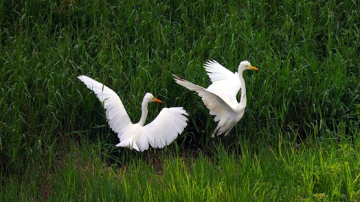 白鷺披著一身潔白的羽毛,展開輕盈的翅膀,嬉戲于水草邊。 晨報(bào)攝友 高文勝 攝 ?