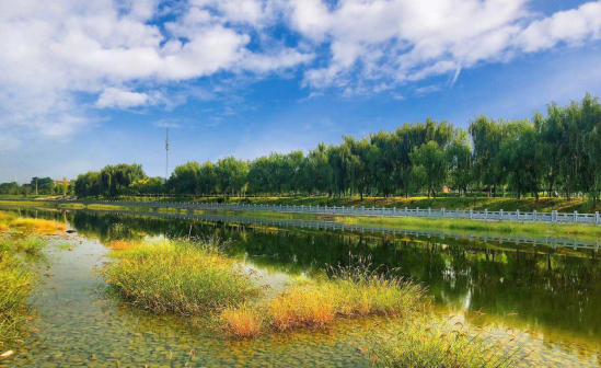 河道上,茂盛的水草,掩映于清澈的水中,與藍天白云構(gòu)成一幅美麗的畫卷。