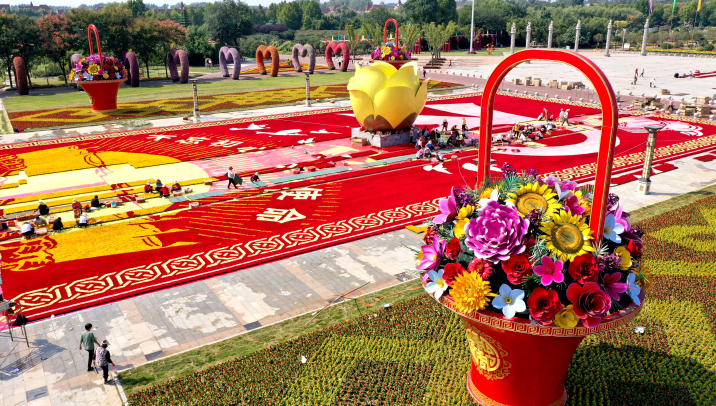 9月24日,工作人員在鄢陵國家花木博覽園主廣場擺放“盛世祖國”鮮花花毯?!笆⑹雷鎳滨r花花毯占地面積2580㎡,由70周年數(shù)字和國徽、“不忘初心、牢記使命”字樣、和平鴿、初升的太陽等圖案組成,寓意在中國共產(chǎn)黨的領導下,祖國和平、繁榮、昌盛。據(jù)悉,“盛世祖國”鮮花花毯由紅色、粉色、黃色等幾種顏色的康乃馨、勿忘我等鮮切花精心搭配組合,用花總量300余萬株。9月26日,開幕式將在鄢陵國家花木博覽園舉行。記者 牛書培 攝 ?