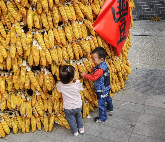近日,我市建安區(qū)一些獲得豐收的農(nóng)民在曹魏古城展示農(nóng)產(chǎn)品。兩個(gè)可愛的孩子也被豐收?qǐng)鼍拔?,在“玉米山”前歡笑雀躍。