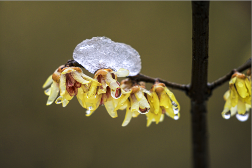 瞧,漸漸融化的雪“親吻”著蠟梅,它們像一對好伙伴般依依不舍。那流淌在花瓣間的水滴好似蠟梅因?qū)ρ賾俨簧岫氏碌难蹨I。