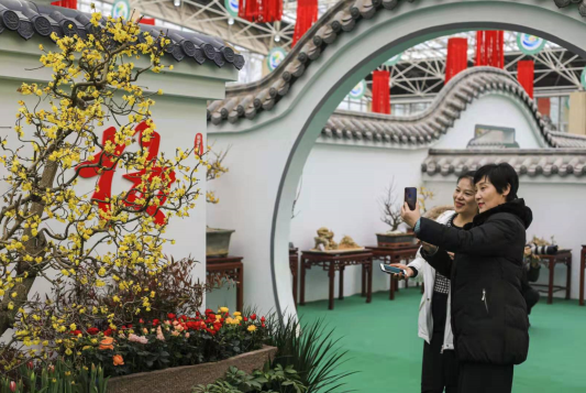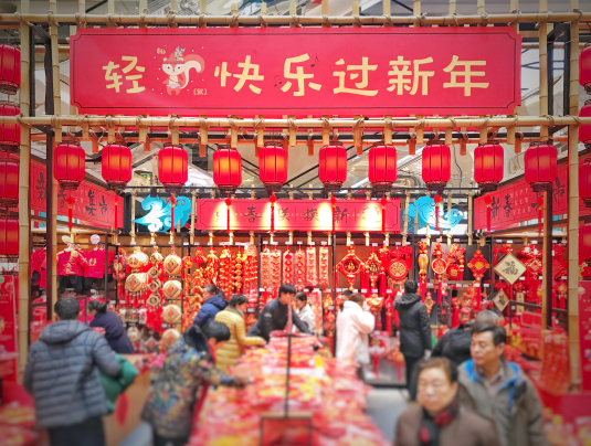商場(chǎng)里自不必說,年貨云集,一派喜氣洋洋的氣氛。廟會(huì)上熙熙攘攘,好不熱鬧。蠟梅園內(nèi),游客們記錄著蠟梅之美,紅色的“梅”字與紅色的裝飾、綻放的花兒,傳達(dá)出喜慶的氣息。