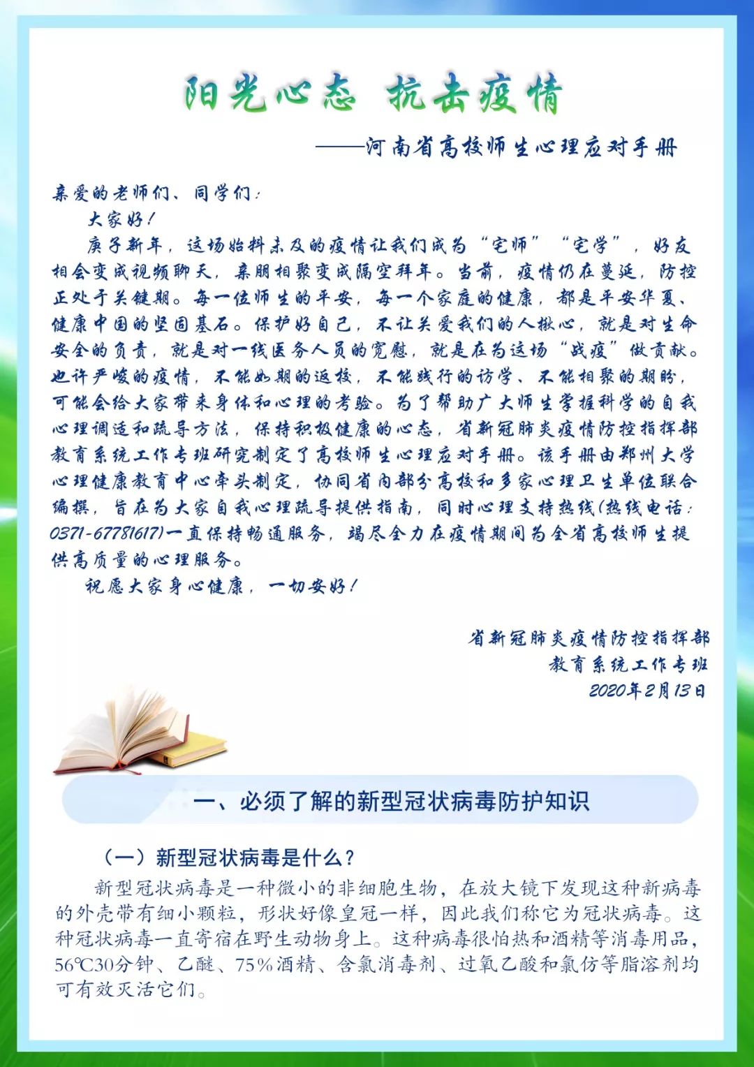 為了幫助廣大師生理性客觀面對(duì)疫情,掌握科學(xué)的自我心理調(diào)適和疏導(dǎo)方法,保持積極健康的心態(tài),省新冠肺炎疫情防控指揮部教育系統(tǒng)工作專班研究制定了河南省高校師生心理應(yīng)對(duì)手冊(cè)。