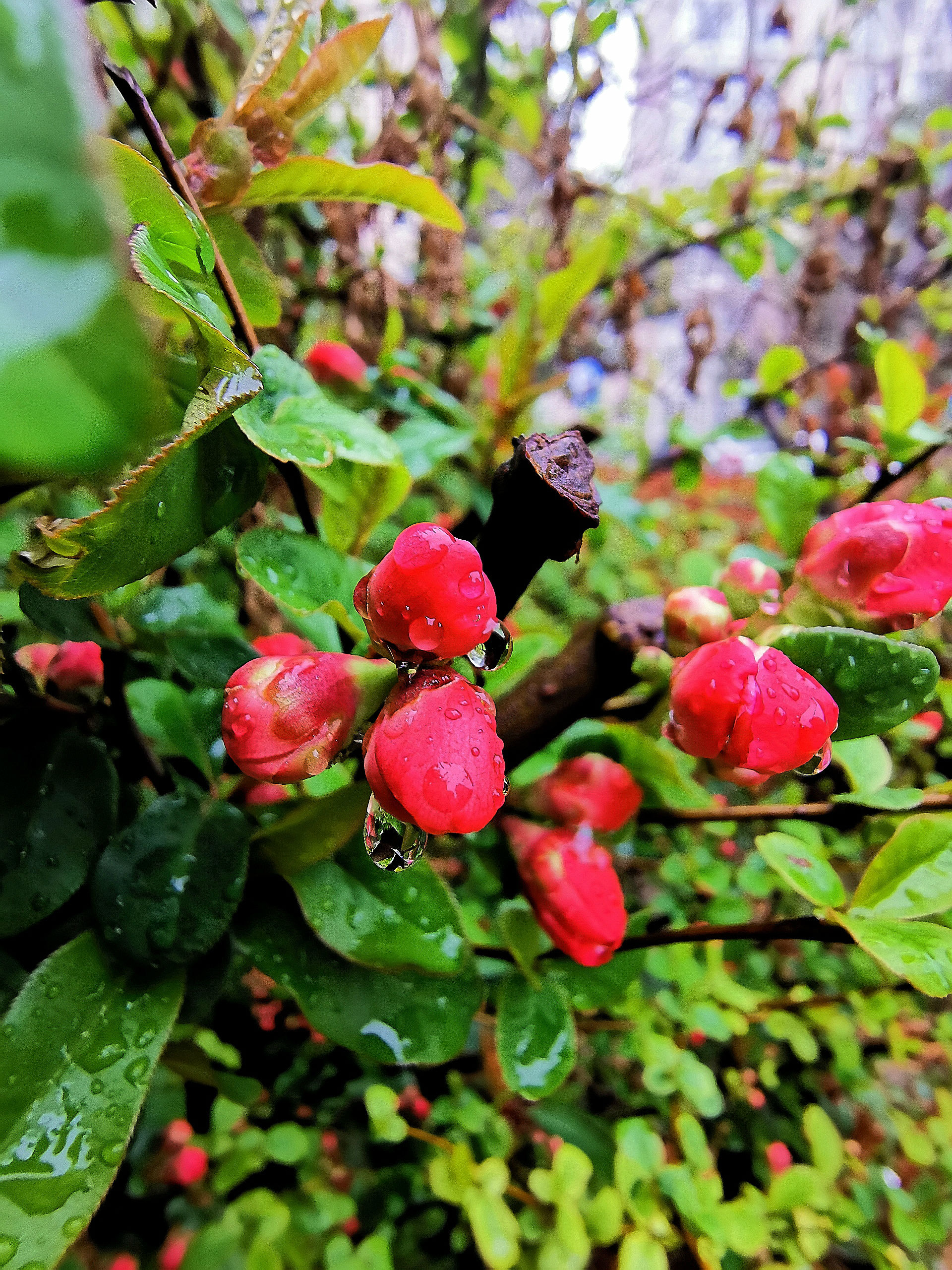 3月9日,春雨悄然落下,市區(qū)公園、游園內(nèi)的貼梗海棠含苞待放,掛滿晶瑩的雨珠,春景如畫。 記者 毛迎 攝