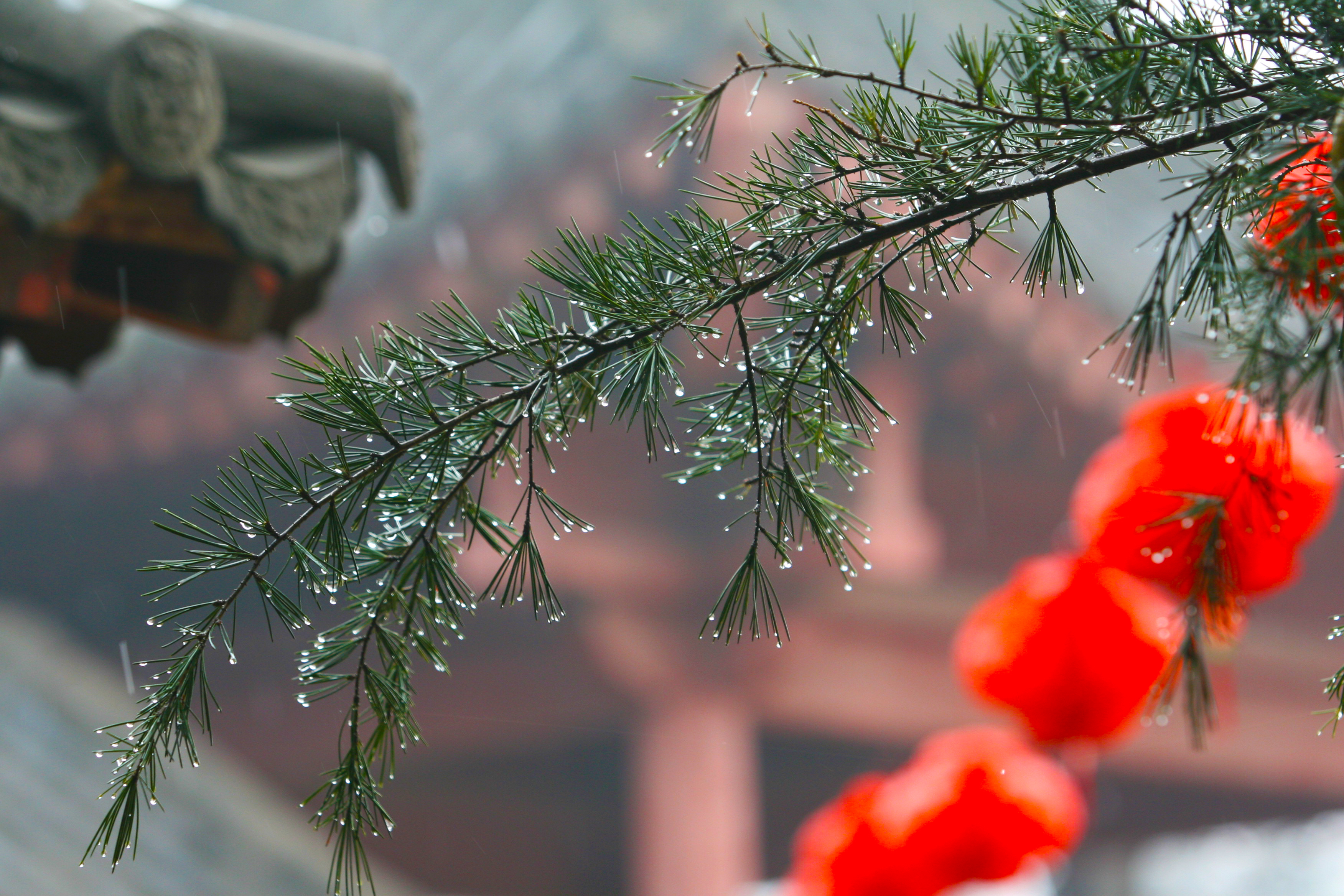 3月9日,西湖公園,翠綠的松枝在春雨的滋潤下與仿古建筑、紅燈籠相映成趣,構(gòu)成一幅迷人、絢麗的唯美畫卷。當(dāng)日,我市迎來一場(chǎng)春雨,西湖公園景色妖嬈。 記者 牛書培 攝