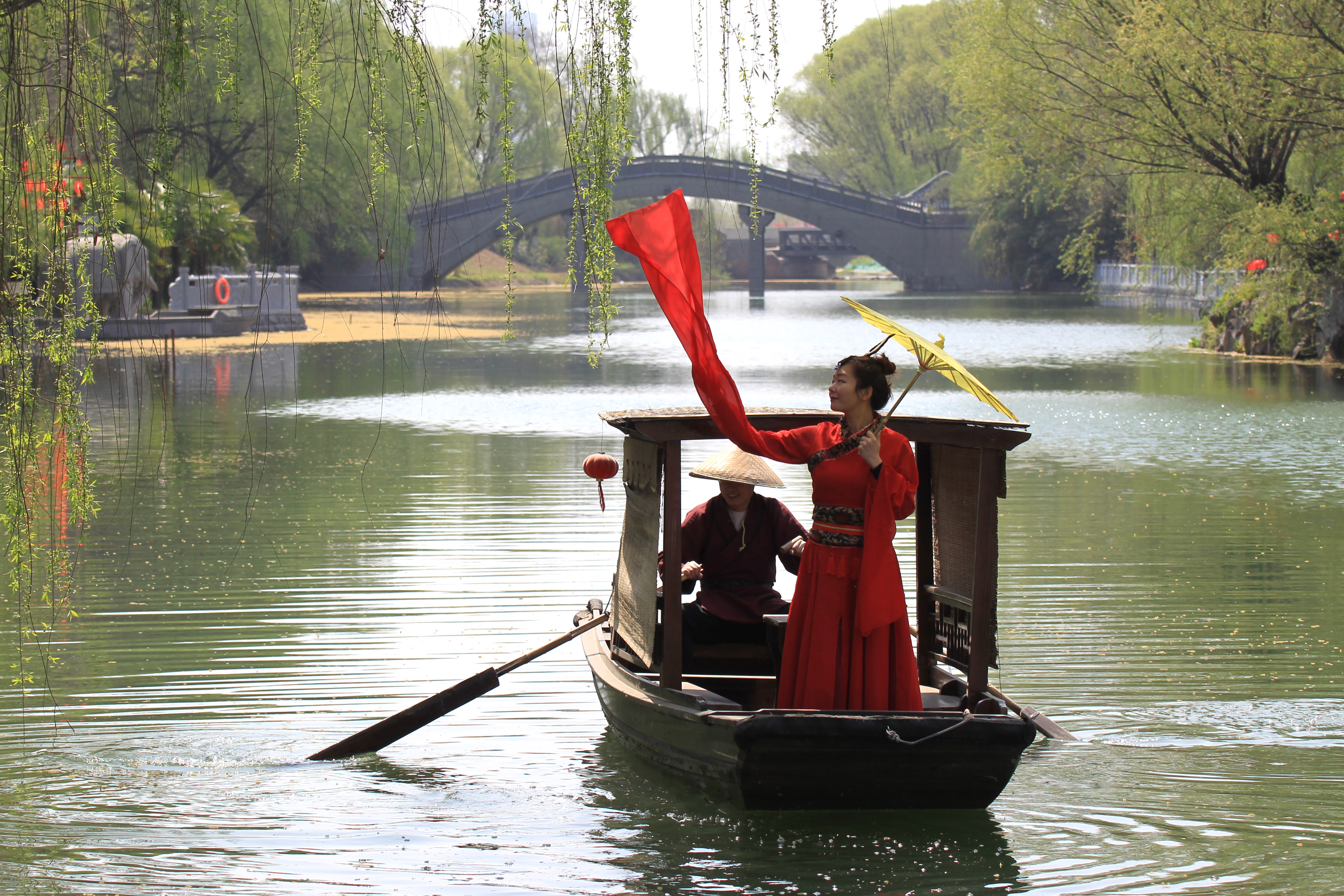 楊柳依依、碧波蕩漾、花吐芬芳 春色畫卷,美不勝收 3月23日,游客身著漢服在灞陵河游玩觀光。 記者 牛書培 攝