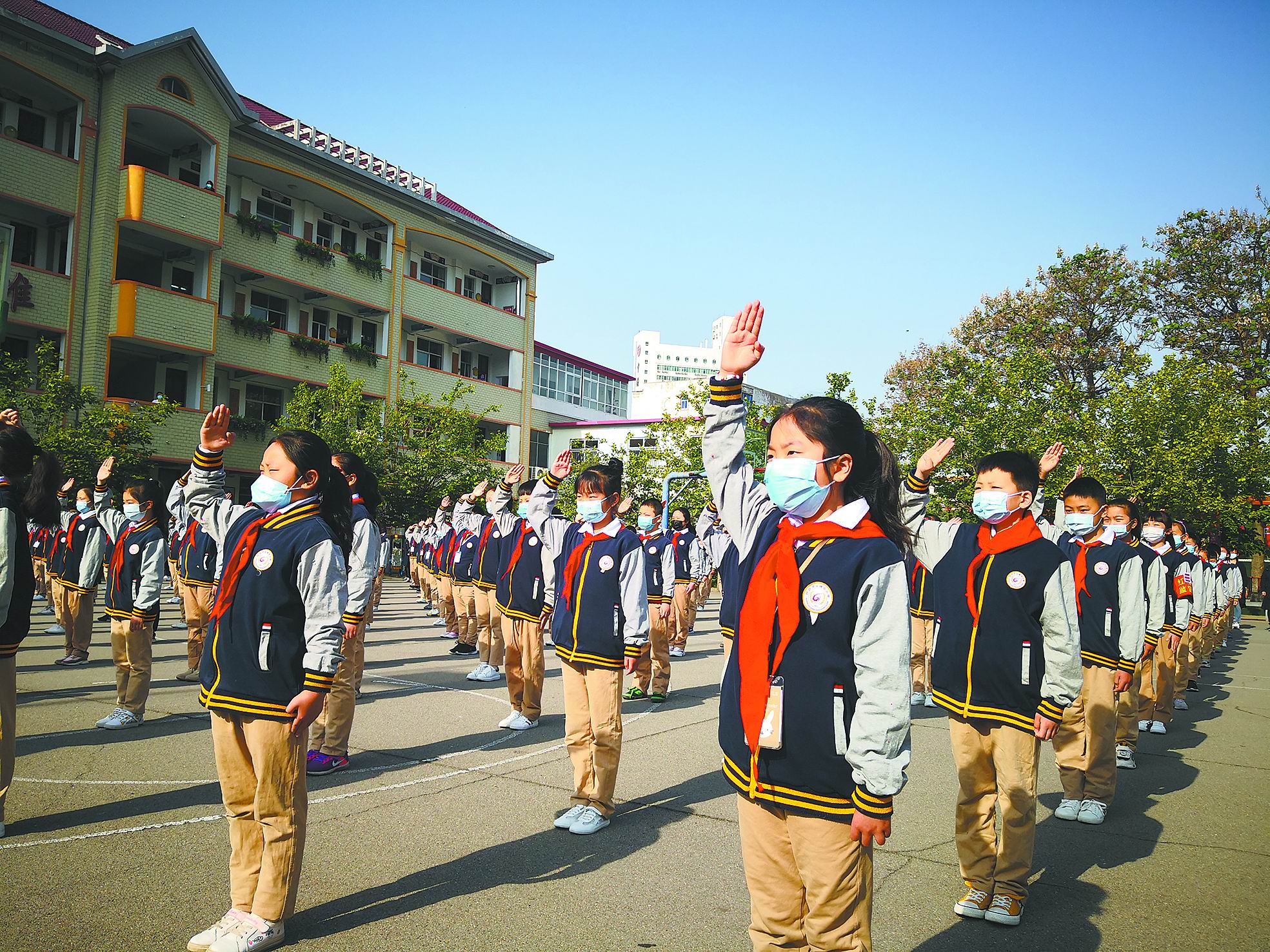 4月26日,經(jīng)過漫長的“寒假”,我市初中一、二年級,中職類一、二年級及小學(xué)四、五、六年級學(xué)生終于返校復(fù)學(xué)。圖為市古槐街小學(xué)舉行升旗儀式暨春季開學(xué)典禮。