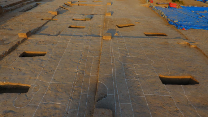 還有一處特殊遺跡,專家們至今難以定性。該遺跡位于大型居住中心基址前面,現(xiàn)存多排,已發(fā)現(xiàn)100多米,采用了當(dāng)時(shí)中國最為先進(jìn)的土木工藝法式——版筑法,類似現(xiàn)代鋪地板磚,而且使用跨度很長,可能是一處公共場所,這種布局頗有“前殿后寢”的樣子。