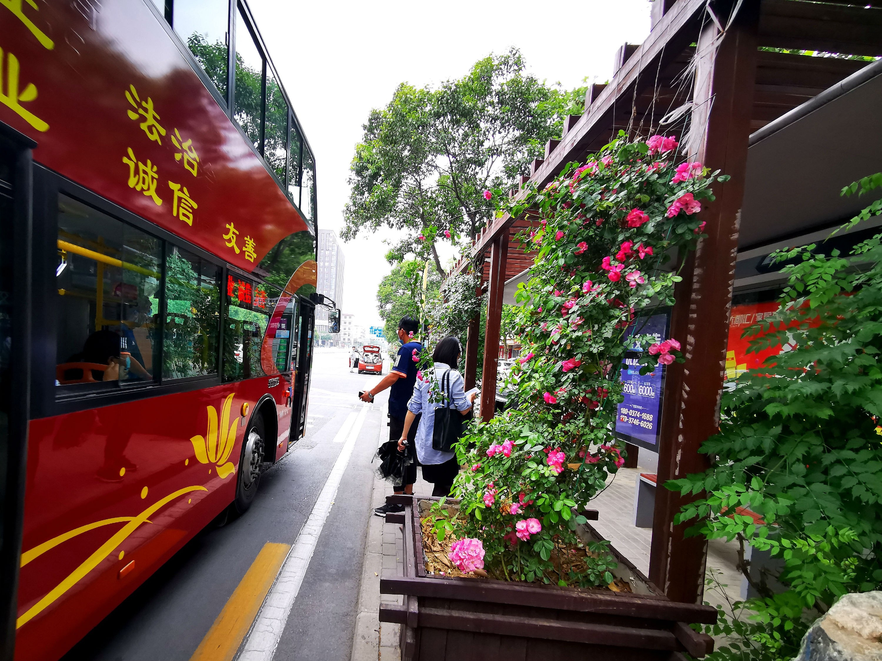 5月20日10時許,市民柴娟來到位于文峰路和建安大道交叉口東側(cè)的一個公交候車亭等車?!斑@個候車亭被鮮花包圍著,看上去真浪漫?!弊诤蜍囃だ锏拈L椅上,欣賞著攀爬在候車亭上的藤本月季,柴娟笑容滿面地說。