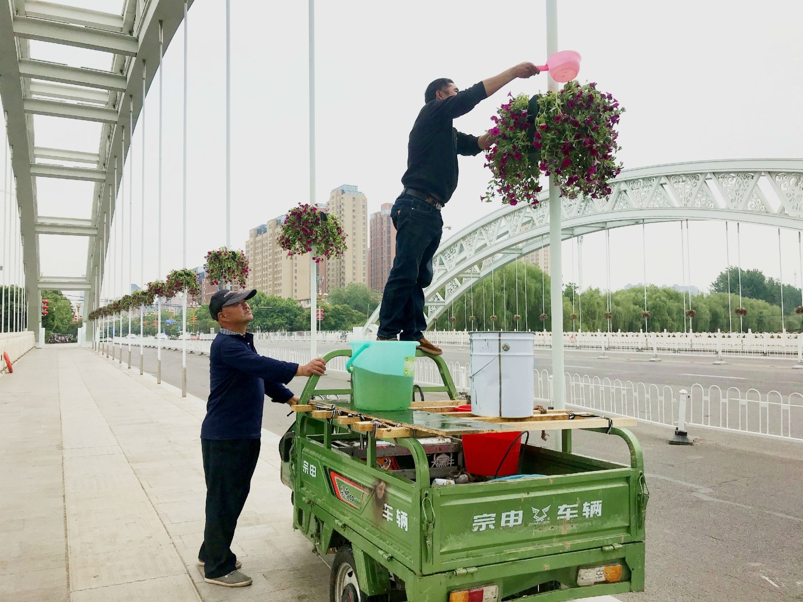 在市區(qū)清潩河建安橋上,兩名工人正在給剛剛種植好的花籃澆水。 記者 張漢杰 攝 □ 記者 毛迎