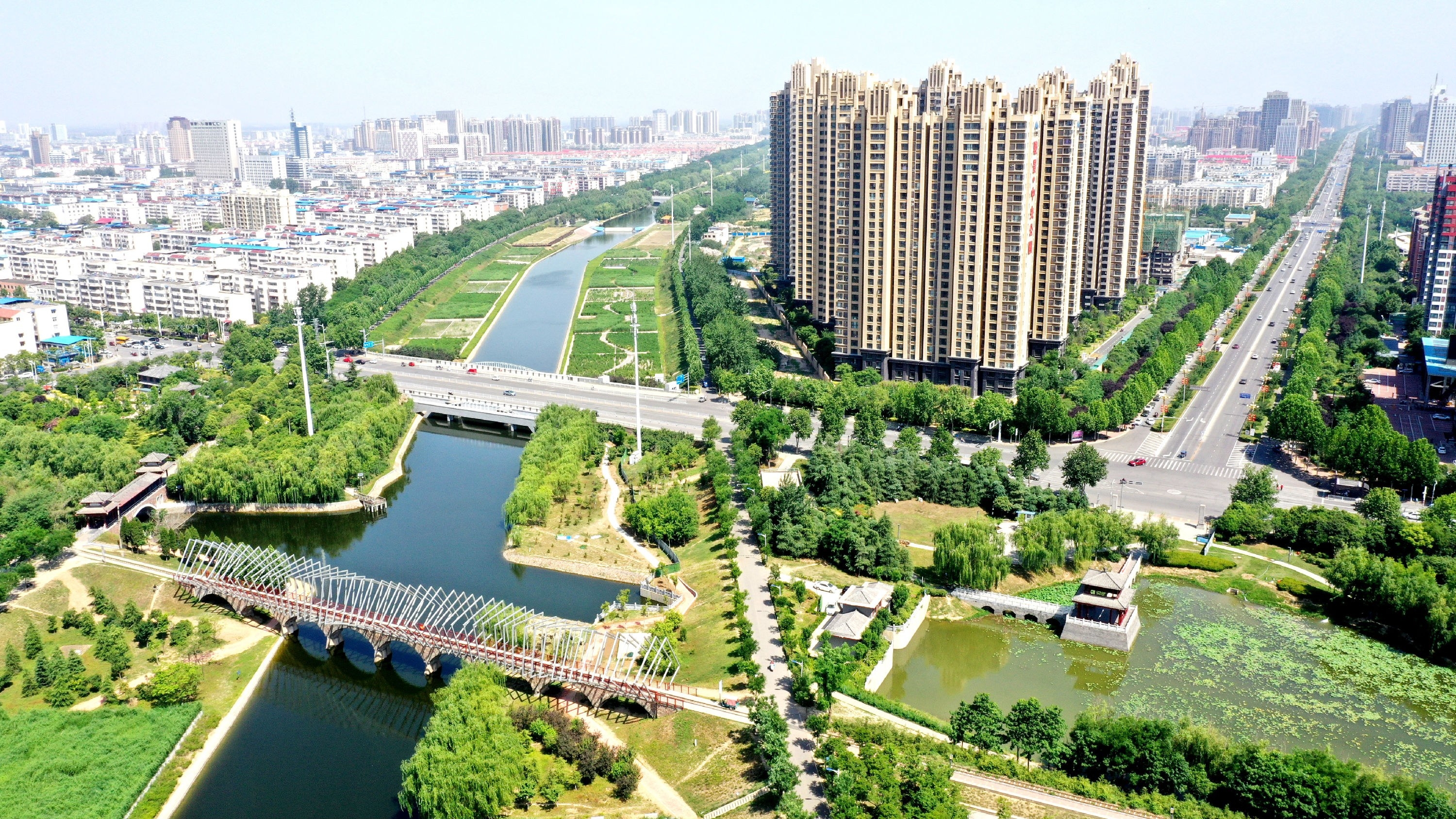 這是5月21日航拍的清潩河及周邊景色。近幾年,我市堅持“規(guī)劃見綠、見縫插綠、協(xié)力植綠”,著力構(gòu)建公共綠地系統(tǒng)。濃濃的綠意,把城市打造成天然的“綠肺”和“氧吧”,市民已經(jīng)享受到“推窗見景,出門進園”的美好生活。穿行于街道,猶如置身一座大花園。透過生命的綠色、美麗的景致,看到的是許昌人追求人與自然和諧、上下齊心協(xié)力共建生態(tài)家園的精美畫卷。記者 牛書培 攝