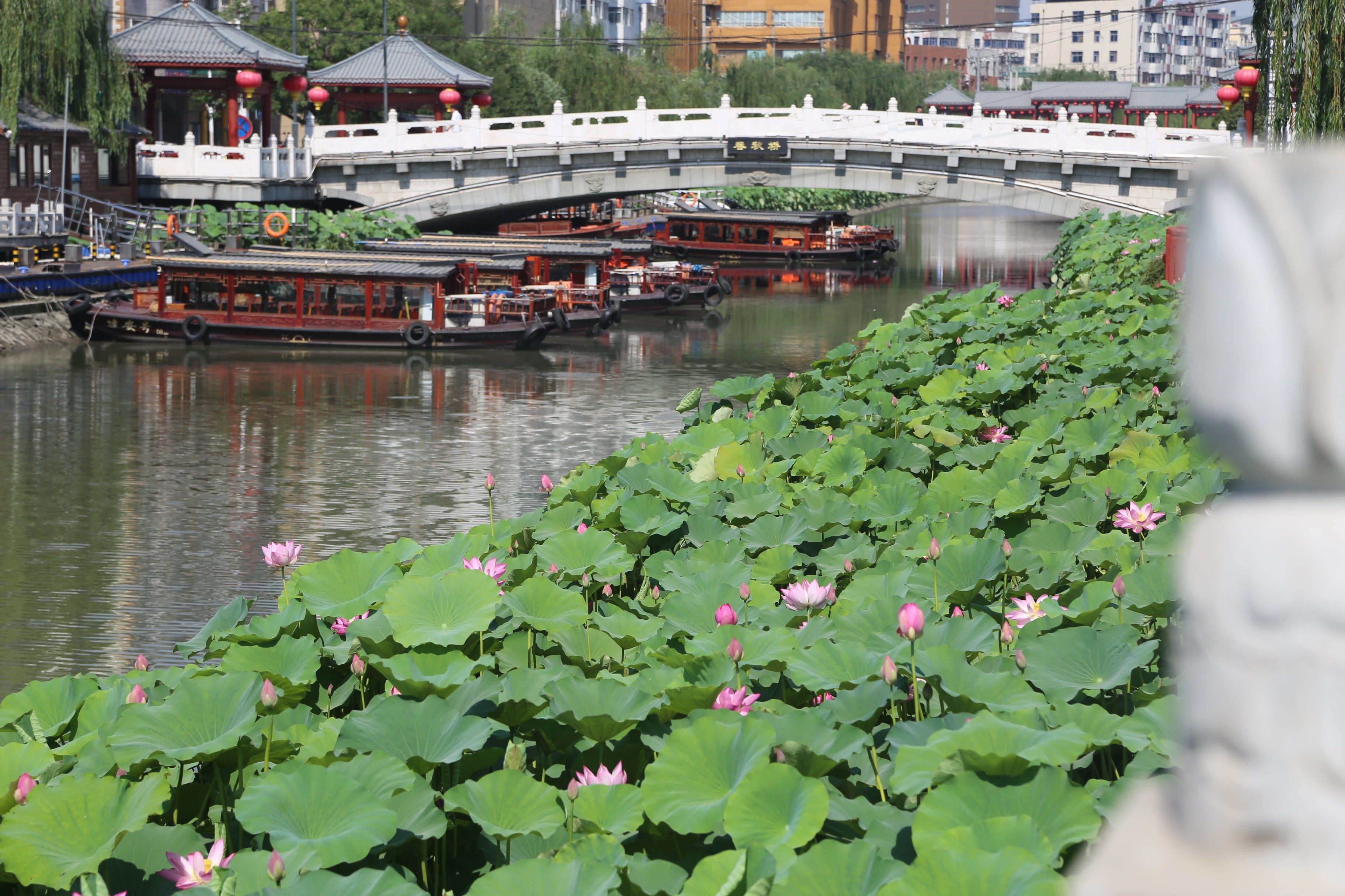 沿著親水賞荷的水上步行棧道,至南關(guān)橋和春秋橋。在春秋橋東側(cè),數(shù)株艷陽天正在綻放。艷陽天花朵稍小,為重瓣紅蓮,花色艷麗,花瓣較多。南護(hù)城河與東護(hù)城河交匯處是“蓮花灣”。河中荷葉密布,岸上柳樹成蔭。附近的河岸上建有橋頭游園,既有石桌、石凳等休閑設(shè)施,又有亭臺軒榭矗立河邊。