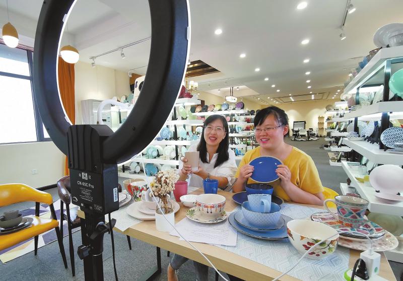 6月16日,許昌格羅科實業(yè)有限公司,兩名工作人員以網(wǎng)絡(luò)直播的方式在第127屆中國進(jìn)出口商品交易會(簡稱“廣交會”)上進(jìn)行日用瓷產(chǎn)品推介。在全球疫情沖擊下,“云”端廣交會給了全球采購商參與對接的機會,參展企業(yè)紛紛進(jìn)行線上轉(zhuǎn)型,希望抓住新機遇,碰撞出更多新商機。 本報記者 喬利峰 攝