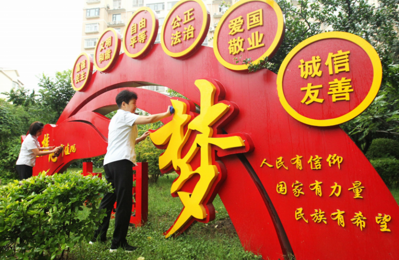 6月17日,東城區(qū)天寶路街道辦事處祥瑞小區(qū)的物業(yè)人員在小區(qū)內(nèi)擦拭社會主義核心價值觀標(biāo)牌。近年來,為營造創(chuàng)建全國文明城市的濃厚氛圍,我市在各大游園、公園、廣場、社區(qū)、主干道添置了文明標(biāo)語標(biāo)牌。一幅幅文明標(biāo)牌將社會主義核心價值觀和文明新風(fēng)尚融入市民生活,融入城市環(huán)境,讓居民抬眼可見,潛移默化地接受文明理念的熏陶。記者 牛書培 攝