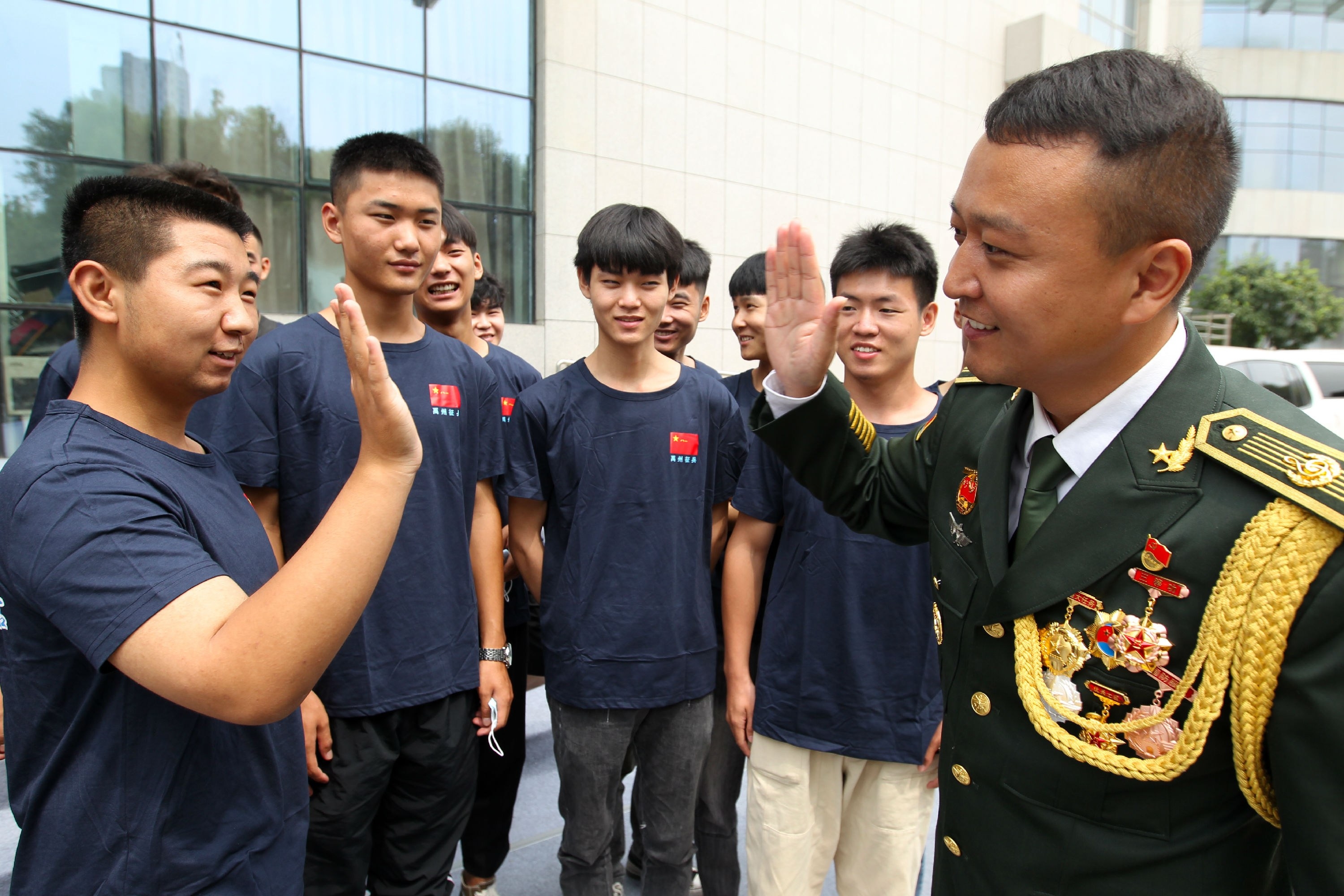 7月11日,禹州籍退役軍人楊洋和應(yīng)征大學(xué)生擊掌。當(dāng)日,禹州市人武部舉辦2020年應(yīng)征大學(xué)生政策宣講會,聘請軍旅生涯中參加過三次大閱兵的退役軍人楊洋作為今年征兵工作“宣傳大使”?;顒蝇F(xiàn)場,楊洋向廣大應(yīng)征大學(xué)生講述了三次參加大閱兵的難忘經(jīng)歷。楊洋表示,退伍不褪色,部隊的培養(yǎng)、軍人的素質(zhì)已深深印刻在他的骨子里。他一定努力樹好形象,鼓勵更多的家鄉(xiāng)青年參軍報國,實(shí)現(xiàn)人生理想。 記者 牛書培 攝