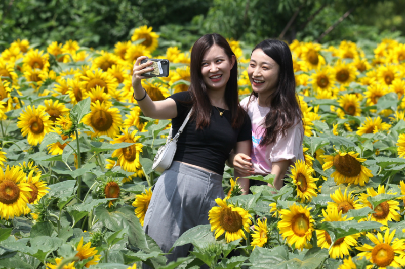 7月18日,游人在向日葵花海旁拍照。目前,襄城縣湛北鄉(xiāng)北姚村葵花正艷,黃花綠葉交相輝映,吸引眾多市民、游客前來觀賞。近年來,襄城縣湛北鄉(xiāng)大力發(fā)展鄉(xiāng)村旅游,吸引游客前來體驗(yàn)生態(tài)風(fēng)光,品味特色美食,以旅游發(fā)展帶動(dòng)農(nóng)民經(jīng)濟(jì)的增收,推動(dòng)襄城縣鄉(xiāng)村旅游業(yè)健康、快速發(fā)展。記者 牛書培 攝
