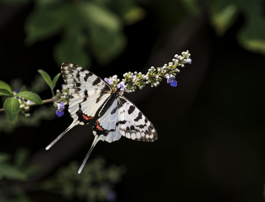 劉喜芳老師拍攝的蝴蝶是絲帶鳳蝶,隸屬于鳳蝶科絲帶鳳蝶屬。絲帶鳳蝶在國(guó)內(nèi)曾被列為我國(guó)14種珍貴種類(lèi)之一。在江浙地區(qū),人們將雄雌絲帶鳳蝶比為“梁祝蝶”。絲帶鳳蝶雌雄顏色也不一樣,雌蝶翅的顏色較深,雄蝶翅的顏色淺而亮。圖一為雄性絲帶鳳蝶。