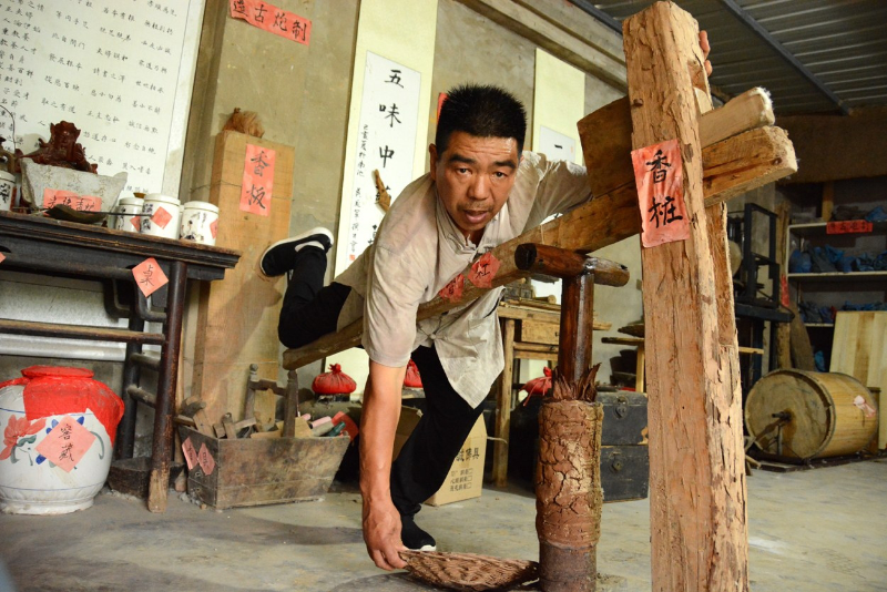 與灞陵橋景區(qū)一墻之隔的是張氏古法手工制香技藝傳承基地。在這里,記者見到了艾葉簍、香料桶、香板、香柱、香樁、香錘、香機(jī)等手工制香器具。
