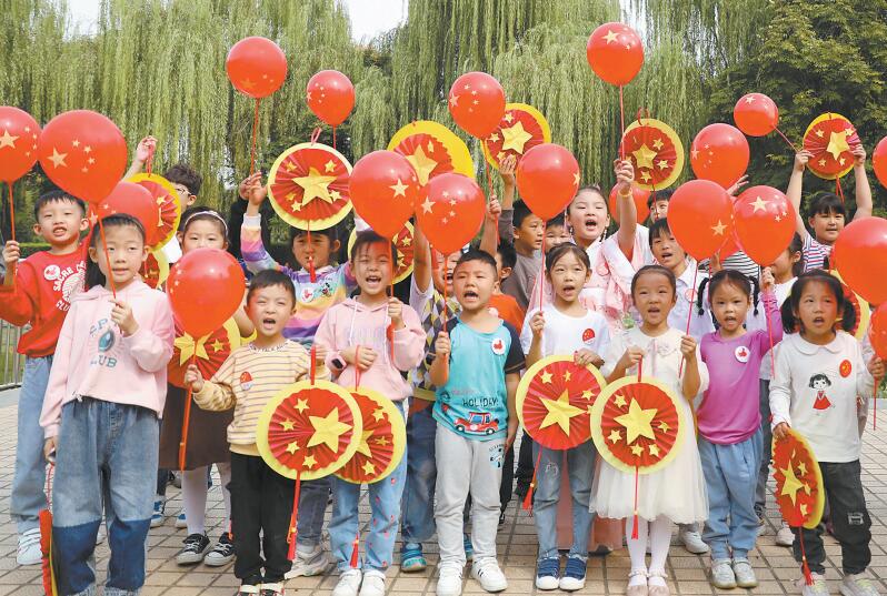 10月1日,在市區(qū)春秋廣場,孩子們通過做手工的方式祝福祖國,歡度國慶佳節(jié)。(許昌日報記者 喬利峰 攝)