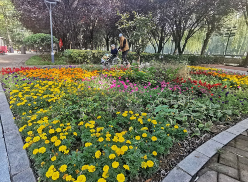 金秋時(shí)節(jié),清潩河游園一處處花境色彩繽紛,引得游人駐足欣賞。花境是園林綠地一種特殊的種植形式,是模擬自然界中多種野生花卉交錯(cuò)生長的狀態(tài),運(yùn)用藝術(shù)手法設(shè)計(jì)成的一種花卉應(yīng)用形式。 記者 毛迎 攝 ?