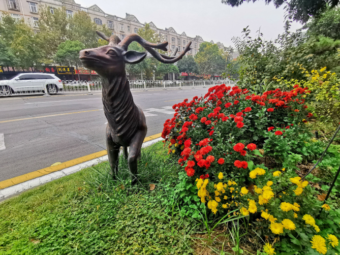 “颯颯西風(fēng)滿院栽,蕊寒香冷蝶難來?!鼻锛臼蔷栈ㄊ㈤_的季節(jié)。10月27日,記者在市區(qū)建安大道看到,綠化帶里各色菊花盛開,紅的勝火,黃的似金,與栩栩如生的小鹿雕塑相映成趣,非常好看。