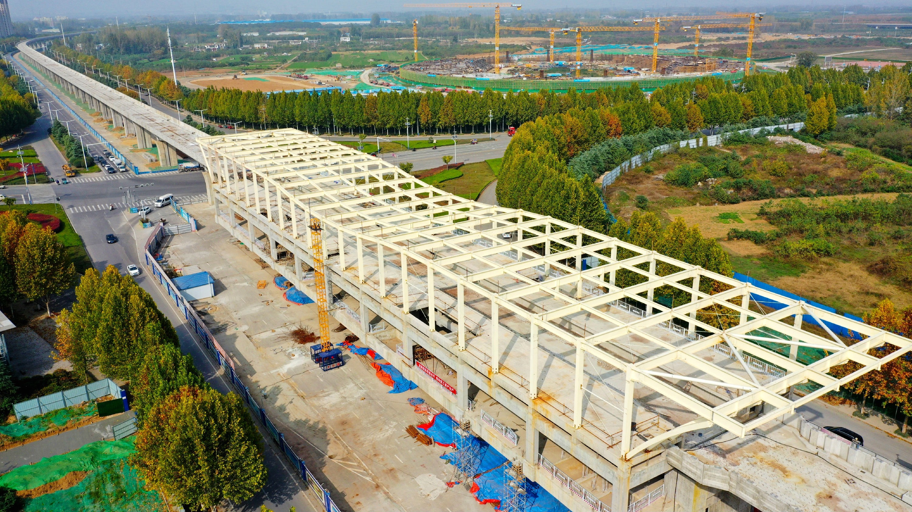 11月3日航拍的鄭許市域鐵路新元大道站鋼結(jié)構(gòu)施工現(xiàn)場(chǎng)。 鄭許市域鐵路是我市首條城市軌道交通干線,是推動(dòng)鄭許一體化的標(biāo)志性工程。目前,鄭許市域鐵路許昌段新元大道站、潁川大道站、葛天大道站、北苑大道站已經(jīng)全面開展鋼結(jié)構(gòu)施工,農(nóng)大路站、昌盛路站等四個(gè)車站的風(fēng)雨棚鋼結(jié)構(gòu)已經(jīng)構(gòu)建完成,正在進(jìn)行金屬屋面和外立面施工,預(yù)計(jì)春節(jié)前完工。 記者 牛書培 攝
