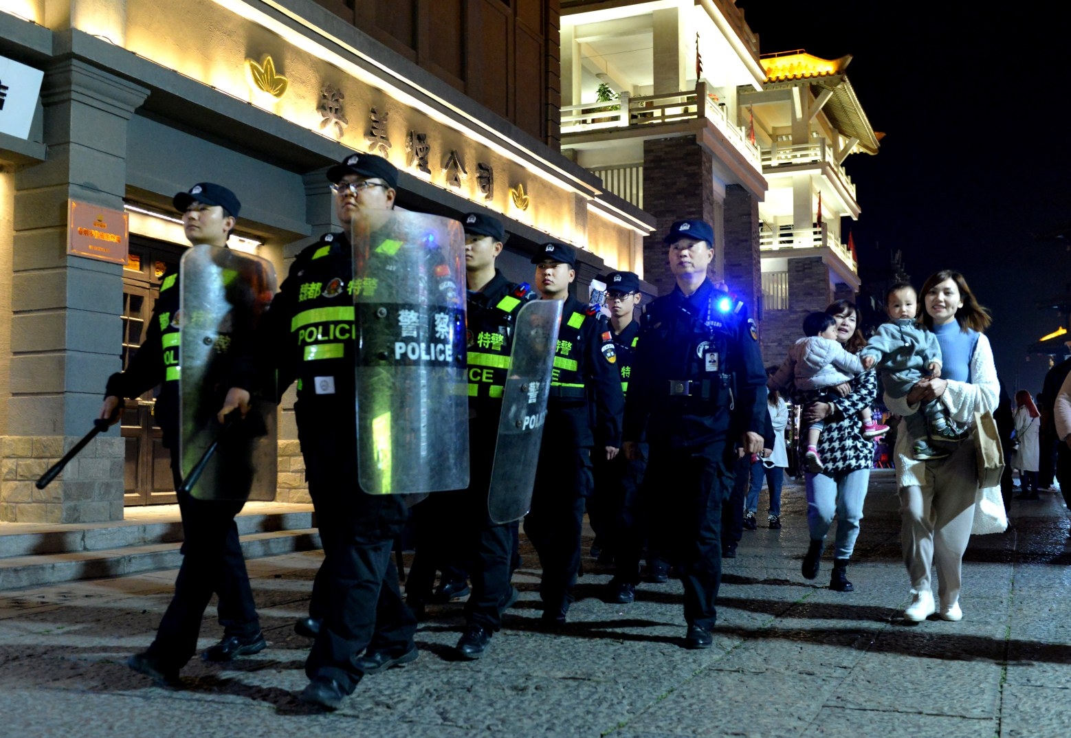 11月11日19時許,曹魏古城南大街,抱孩子游玩的市民從執(zhí)行巡邏任務的許昌市公安局魏都分局特警大隊隊員旁經(jīng)過。近年來,我市深入推進平安建設(shè),不斷加強社會治安綜合治理,依法嚴厲打擊各類違法犯罪活動,全面加大治安防控體系建設(shè)力度,許昌公眾安全感多次領(lǐng)跑全省。 記者 牛志勇 攝