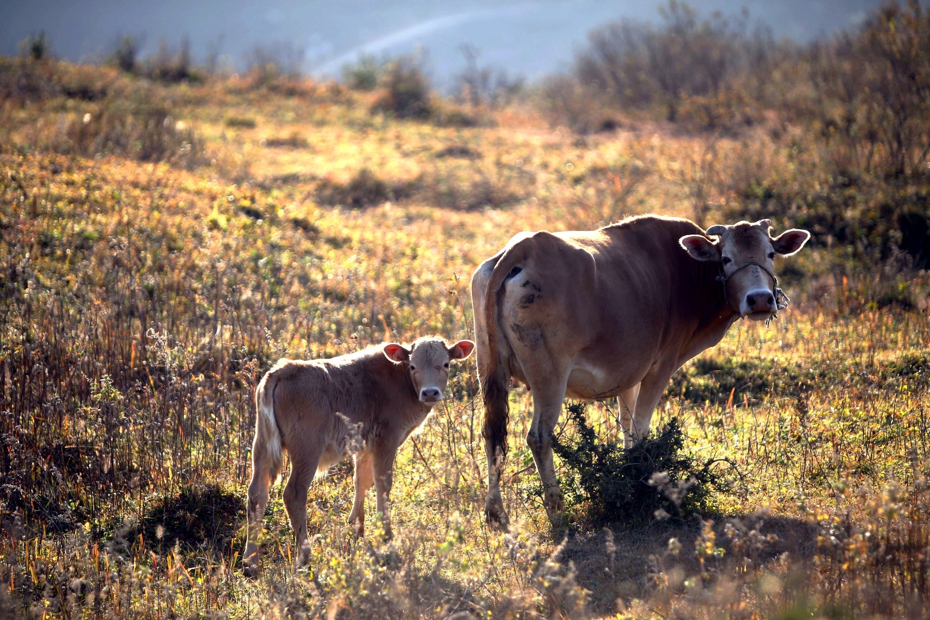 柔和的陽光照在牛兒的身上,似乎給它們勾上了金邊,分外好看。