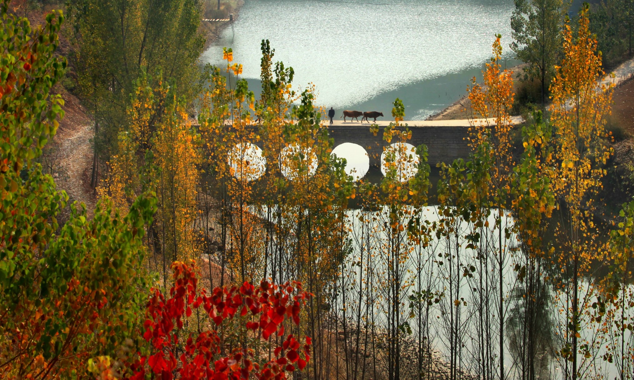 在遠離喧囂的農(nóng)村一隅,透過色彩斑斕的葉子,我們看到農(nóng)人驅(qū)趕著牛兒行走在橋面上。這幅畫面?zhèn)鬟f出靜謐、悠遠的意境。