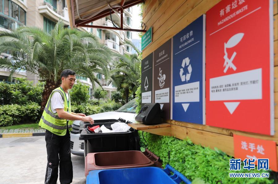 在上海市虹口區(qū)嘉興路街道一處小區(qū),保潔工對(duì)居民分類投放的生活垃圾進(jìn)行分揀(2019年6月24日攝)。新華社記者 方喆 攝