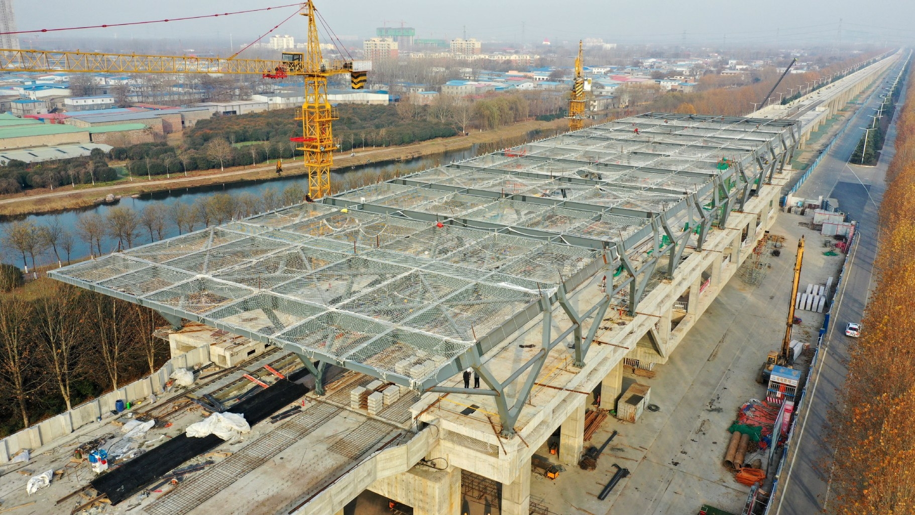 12月21日航拍的鄭許市域鐵路許昌段農(nóng)大路站雨棚鋼結(jié)構(gòu)施工現(xiàn)場(chǎng)。當(dāng)前正值鄭許市域鐵路建設(shè)黃金期,參建單位在確保質(zhì)量、安全的前提下,加快施工進(jìn)度。目前,鄭許市域鐵路許昌段正在大面積架設(shè)各個(gè)站點(diǎn)的雨棚鋼結(jié)構(gòu)和鋪軌。鄭許市域鐵路項(xiàng)目完工后,將縮短從許昌到新鄭國(guó)際機(jī)場(chǎng)的時(shí)間,促進(jìn)鄭許一體化。 記者 牛書培 攝