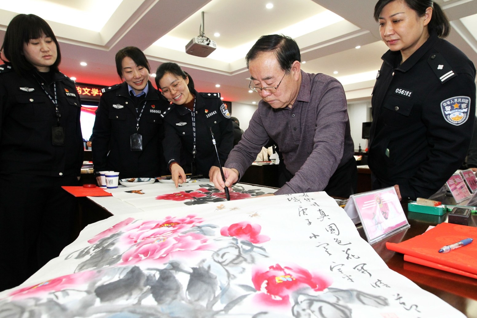 1月7日,一位美術(shù)愛好者為民警繪制牡丹畫。 當(dāng)日,為進(jìn)一步豐富警營文化,落實(shí)“關(guān)愛民警、從優(yōu)待警”措施,我市部分美術(shù)、書法愛好者應(yīng)許昌市公安局魏都分局邀請,來到該局活動(dòng)現(xiàn)場,創(chuàng)作百余幅繪畫、書法作品贈(zèng)予民警,把文化藝術(shù)精品送到民警手上。