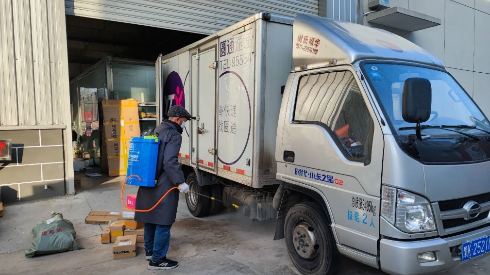 圓通速遞工作人員對快遞車輛進(jìn)行消殺。