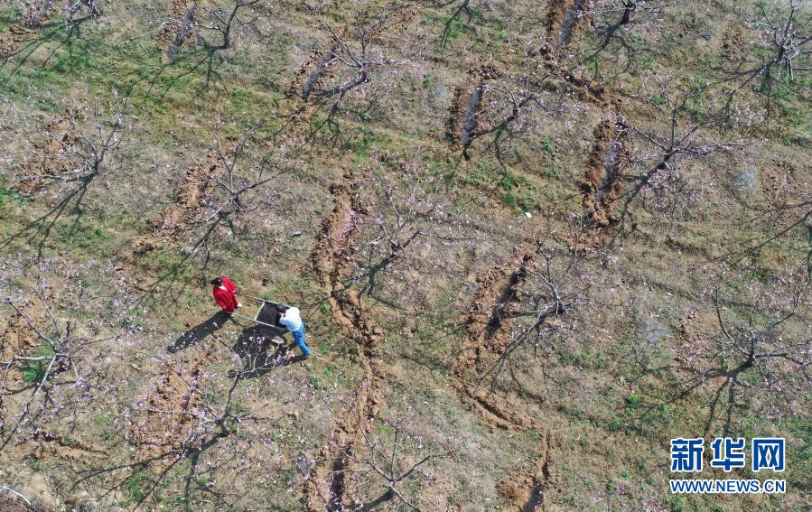 2月15日,在湖南省永州市道縣大坪鋪農(nóng)場,果農(nóng)在給桃樹追肥(無人機(jī)照片)。新華社發(fā)(蔣克青 攝)
