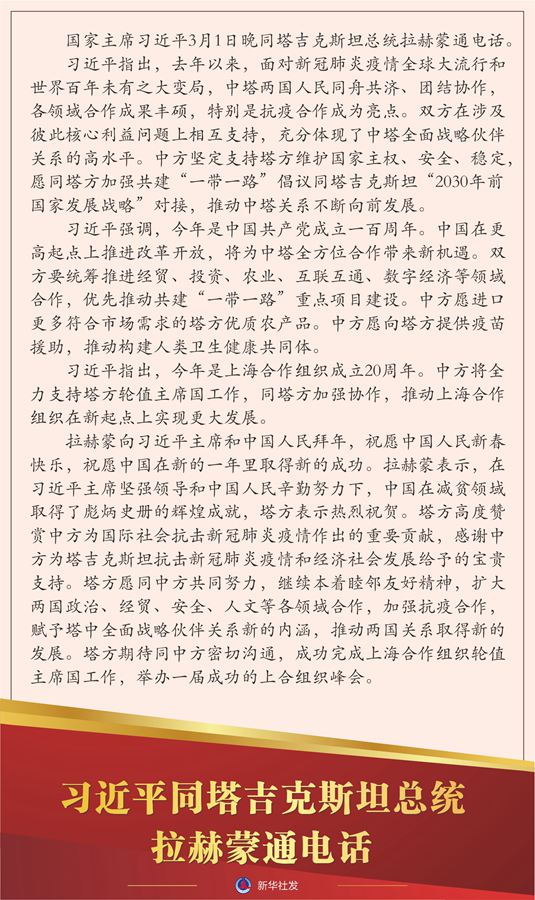 新華社北京3月1日電 國(guó)家主席習(xí)近平3月1日晚同塔吉克斯坦總統(tǒng)拉赫蒙通電話。