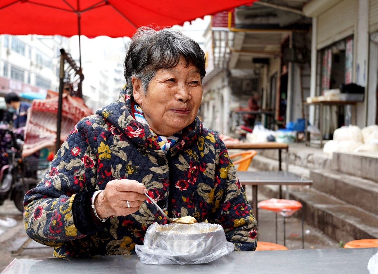 在菜市場吃早飯的老人
