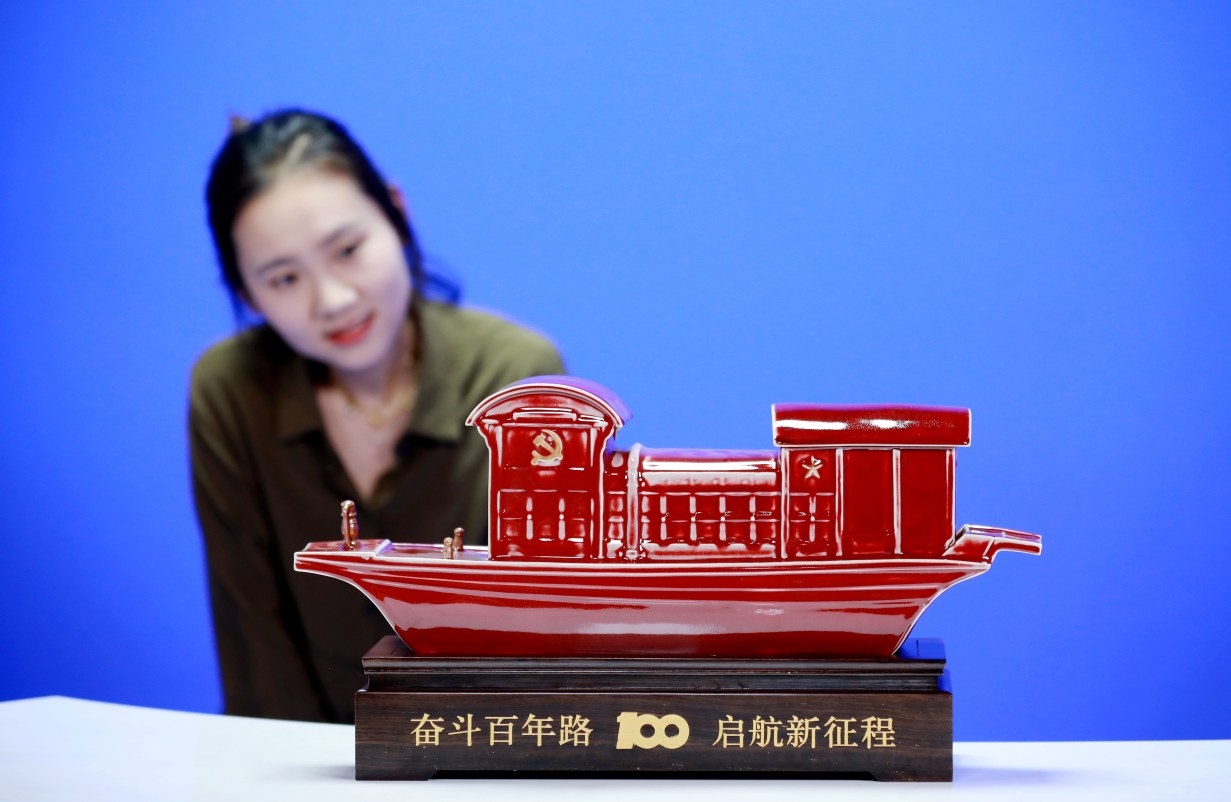 5月19日,游客在禹州市神垕鎮(zhèn)舉行的鈞瓷展上欣賞鈞瓷珍品《紅船禮贊》。該作品采用寫實(shí)手法進(jìn)行造型,以鈞紅釉為主,運(yùn)用浮雕、鏤空等技法,表現(xiàn)了紅船的厚重與博大,贊美“紅船精神”,歌頌中國共產(chǎn)黨不忘初心、牢記使命,帶領(lǐng)中國人民奮斗百年取得的豐功偉績。本報(bào)記者 牛書培 攝