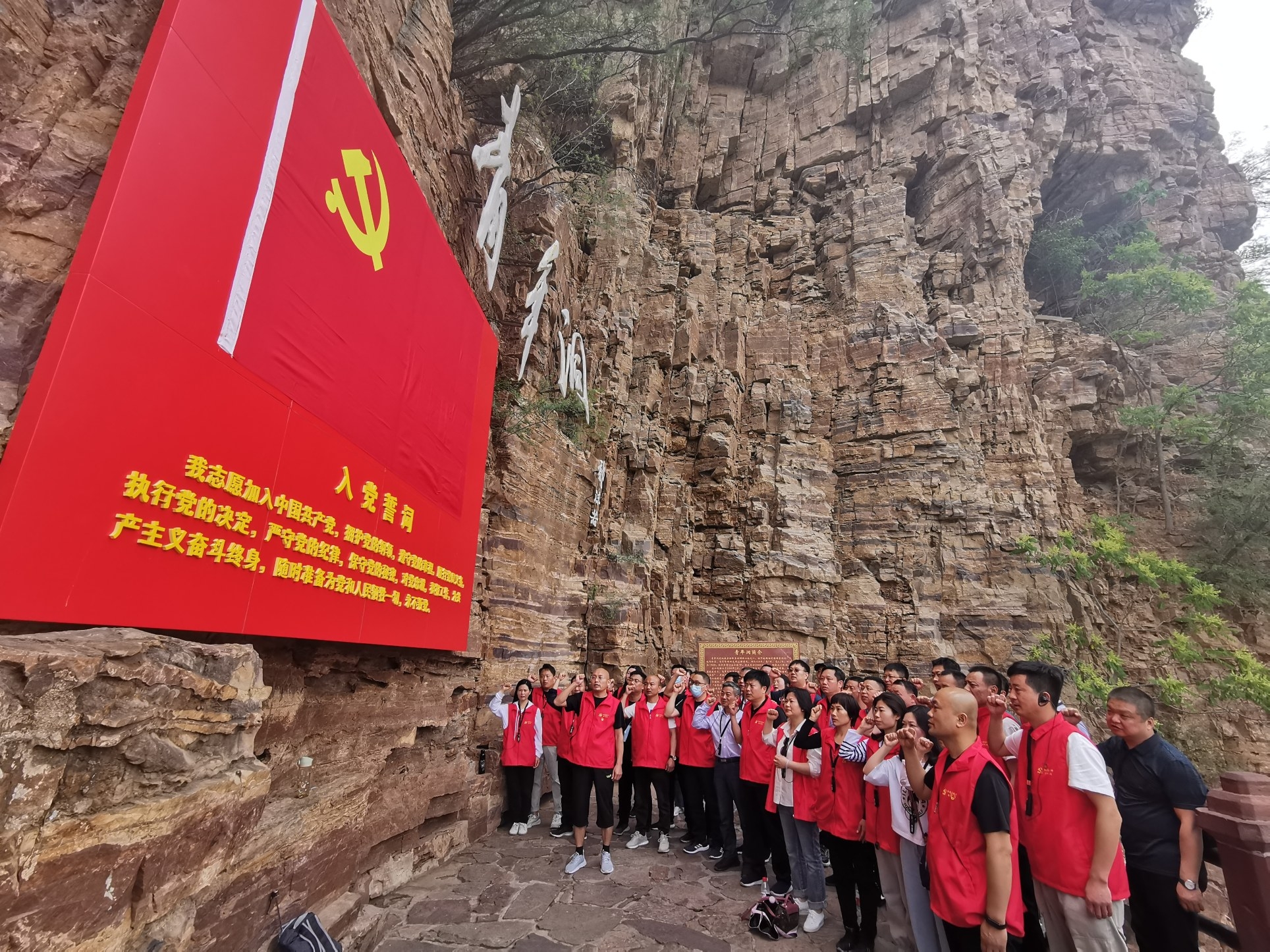黨員們徒步前往紅旗渠總干渠,踏上“紅飄帶”,走過(guò)創(chuàng)業(yè)洞、團(tuán)結(jié)洞,沿著依山而建的渠道,看著千仞峭壁的山洞、堆砌牢固的渠岸,切身感受林縣人民修建紅旗渠時(shí)展現(xiàn)的“愚公奮起十春秋,引來(lái)漳河潤(rùn)田禾”的艱辛和不易,見證紅旗渠工程的壯觀和偉大,激勵(lì)自己牢記黨的宗旨,永葆黨員的新時(shí)代先鋒本色。在青年洞前,黨員們莊嚴(yán)重溫入黨誓詞。