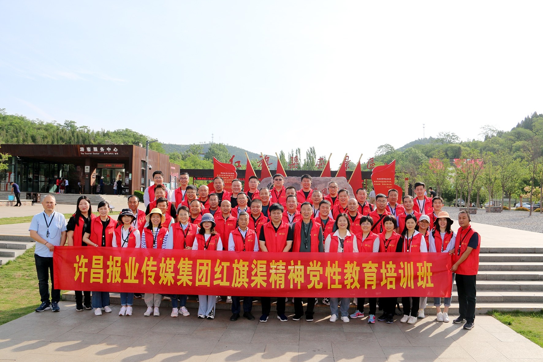黨員們前往紅旗渠總干渠實(shí)地學(xué)習(xí),在景區(qū)入口處合影留念。