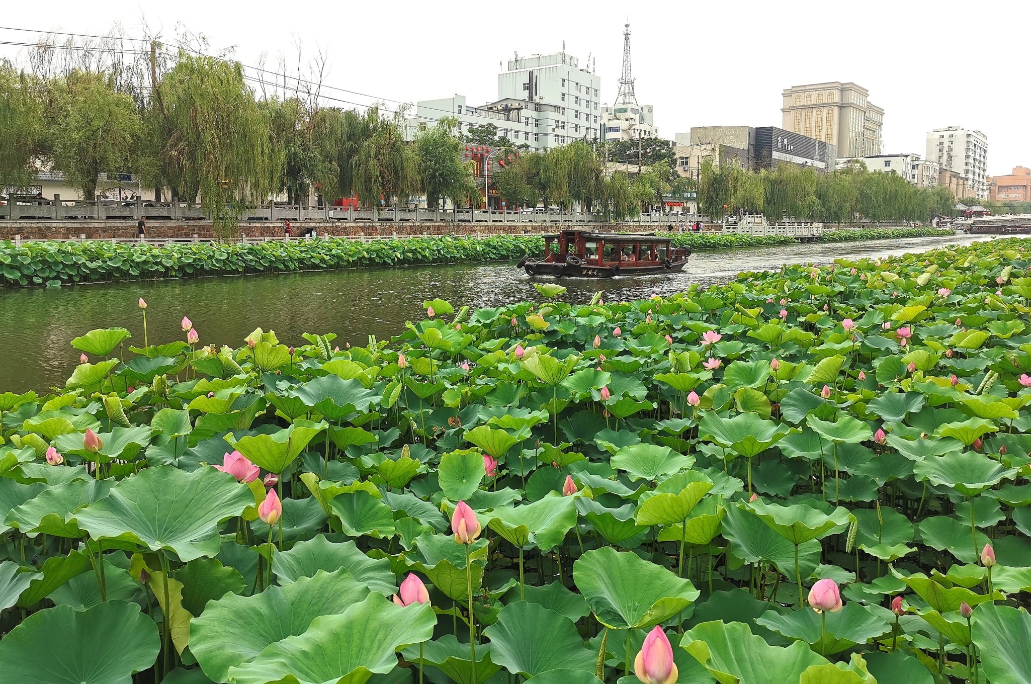 6月13日,游客乘坐仿古游船賞景游玩。初夏,市區(qū)護(hù)城河滿目翠綠,一朵朵粉紅的荷花亭亭玉立,散發(fā)出淡淡清香,良好的生態(tài)環(huán)境讓人流連忘返。近年來,許昌市始終堅(jiān)持綠色發(fā)展理念,持續(xù)推進(jìn)生態(tài)文明建設(shè),人居生態(tài)環(huán)境不斷改善,彰顯出城市特有魅力。 本報(bào)記者 喬利峰 攝
