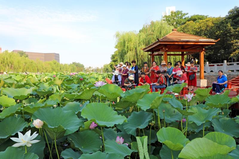 6月22日,許昌市老年大學(xué)在護城河畔舉行“百人繪 頌百年”慶祝建黨100周年大型寫生活動?;顒蝇F(xiàn)場,百名老年繪畫愛好者創(chuàng)作上百幅荷花圖,把對黨的忠誠和熱愛深深融入繪畫作品中,抒發(fā)自己對黨的赤子之情,用飽含激情的筆墨語言向黨的百年華誕獻上一份祝福的厚禮。 本報記者 譚宜姝 攝